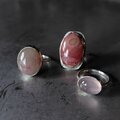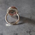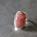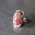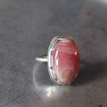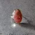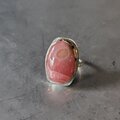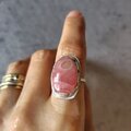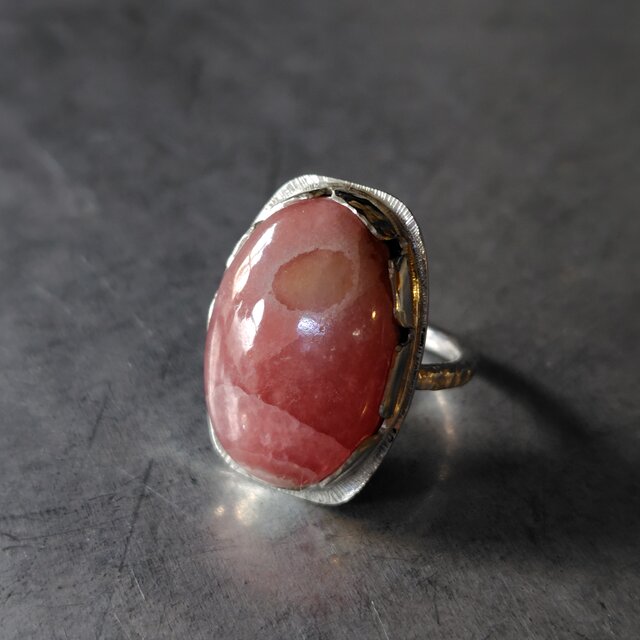 鮮やかな薔薇色に滲む乳白色の不思議な模様存在感のあるロードクロサイトラフに留めて飾り枠を施しシルバーリングに仕立てました。