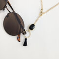 チャーム部分の中央に配したメタルリングに、お手持ちのサングラスや眼鏡を引っかけてお使いいただけます。