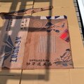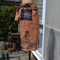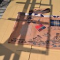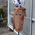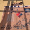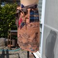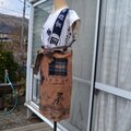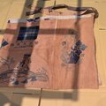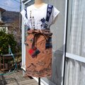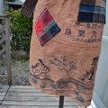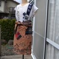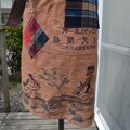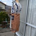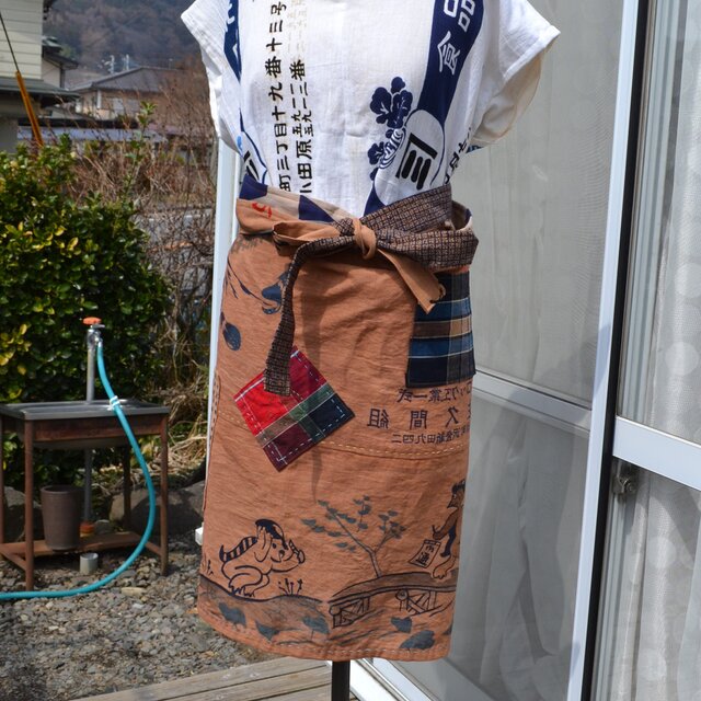 懐かしい絵柄の手ぬぐいを柿渋染めをして、エプロンを作りました。