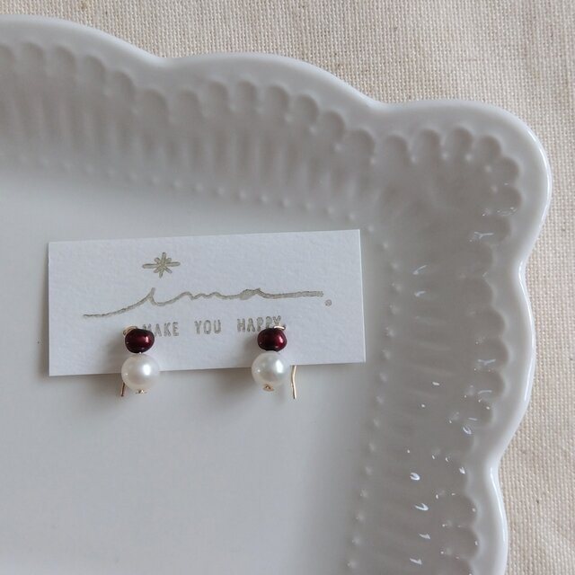 14kgf 深色レッドカラー淡水パールの2粒華奢ピアス