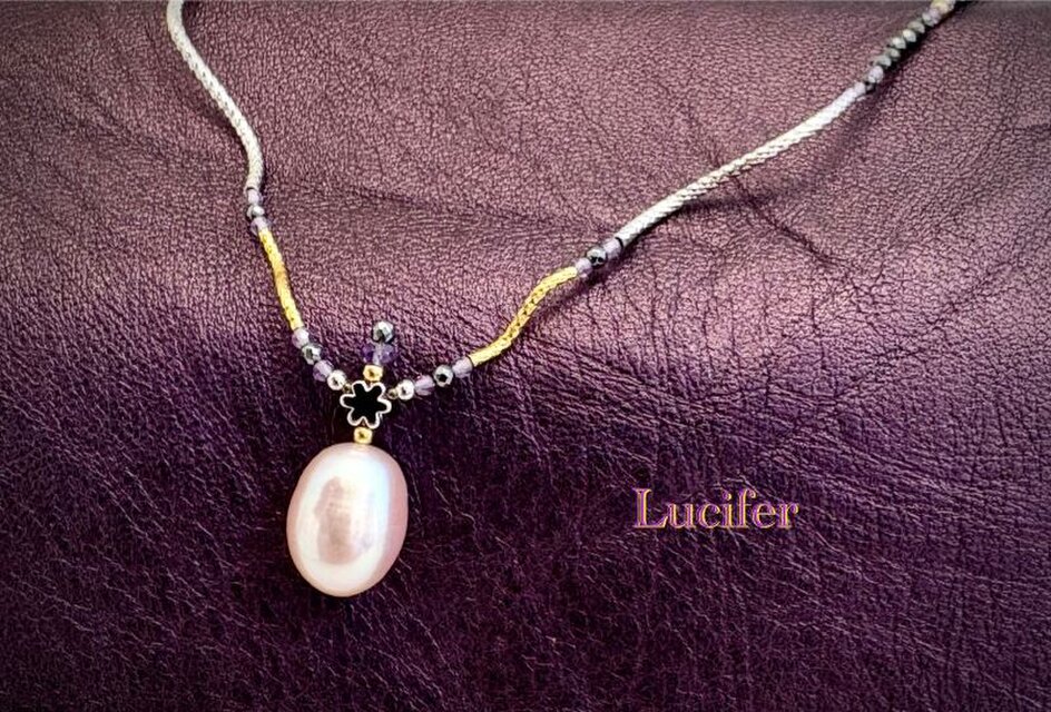 ルシファー、「光をもたらす者」として強く、美しい。そんなイメージでネックレスを作りました。アメジストとヘマタイトでデザインされたピンクのパールをセンターにセット。金銀のS字パイプをフロントに配した個性的なシルエットと輝きは存在感ありありです。少し小悪魔的とも言える雰囲気。ユニークなお洒落好きさんにぴったりなアイテムです。