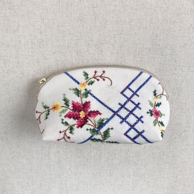 ポーチ ラウンドポーチ 小物入れ クロスステッチの花