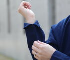 フロントのボタン開きを深めにして、カジュアルになりすぎないように。