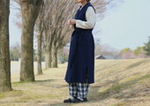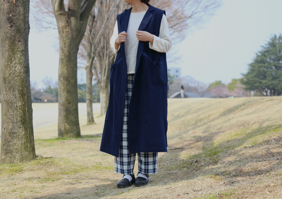 職人さんの美しい手仕事、藍染の布で仕立てた襟付きジレワンピース。