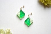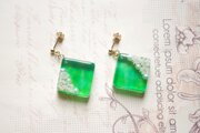 パールとお花をスクエア型のレジンに封じ込め、グリーンとオレンジで着色したピアス。