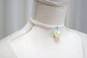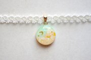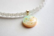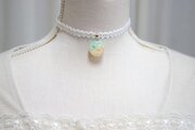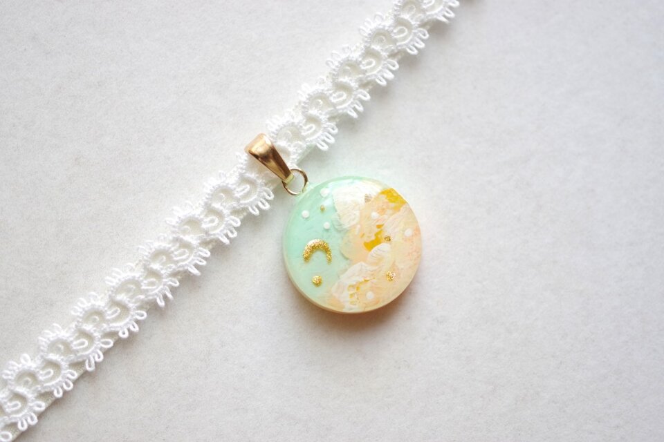 明るいパステルカラーの夜空と輝く三日月がどこか浮世離れしたカラーリングのレジンを、サテンリボンにタティングレースで装飾を施したチョーカーに仕上げました。