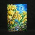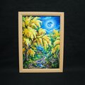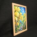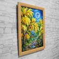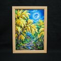 一流の油絵具「ホルベイン」を使用し、厚塗りの油彩ならではの重厚感を感じられるテクスチャーが特長です。A4サイズというコンパクトながら、画面いっぱいに広がるミモザのイエローと満月の冷たいブルーの対比が、お部屋に洗練された華やかさをもたらします。サイズは横210mm×縦297mm、質感豊かな筆致により、特に水たまりに映る景色や遠くの山のシルエットが立体感を生み出し、限られた空間を広がりのあるものにします。