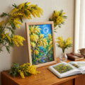 「静寂を照らすミモザ」は、見る人を魅了する幻想的な油絵作品です。夜の静寂を感じさせる中、鮮やかなイエローのミモザが満月の柔らかな光を浴び、その姿はまるで自ら発光しているかのように輝きます。この作品を眺めることで、心の安らぎと「帰る場所がある安心感」が広がります。