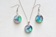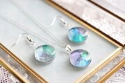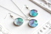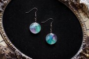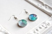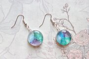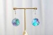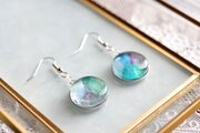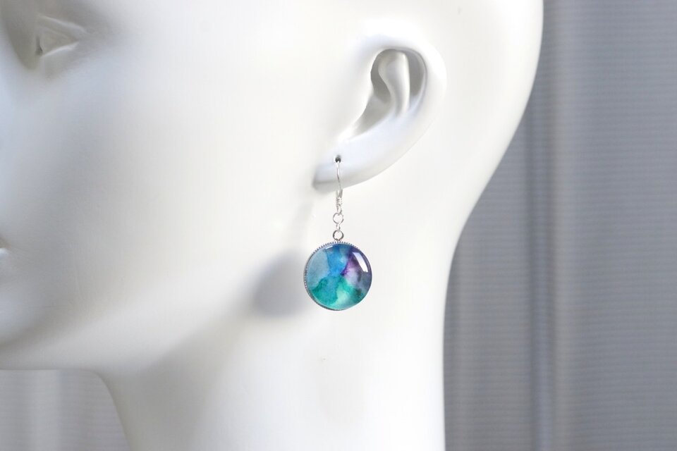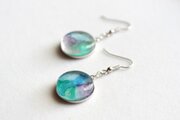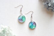 水彩絵の具で描いたような滲んだ紫と緑、青が美しい模様を描いてるピアス。