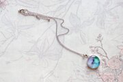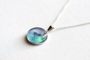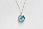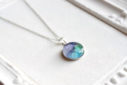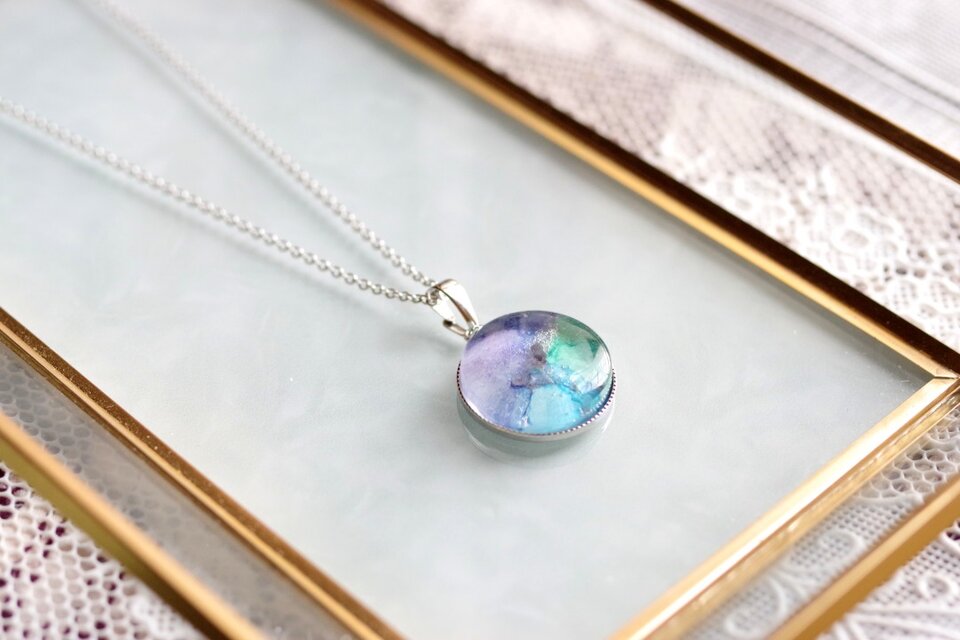水彩絵の具で描いたような滲んだ紫と緑、青が美しい模様を描いてるペンダント。