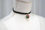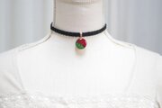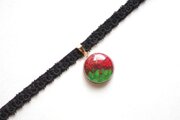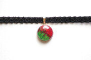 鮮やかな深紅の薔薇とみずみずしい緑色の葉っぱを描いたレジンを、ベルベットリボンにタティングレースで装飾を施したチョーカーに仕上げました。