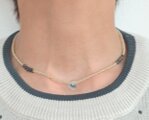 ちょうど鎖骨のあたりにまが玉の形のビーズをアクセントに並べました