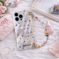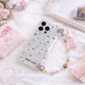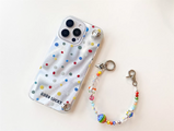 こちらは、[フラワー / ハート / ドット / ジオメトリック / 猫モチーフ / イラスト]など、印象の異なるデザインに、手首に通して使えるビーズハンドストラップを組み合わせたiPhoneケースです。