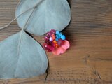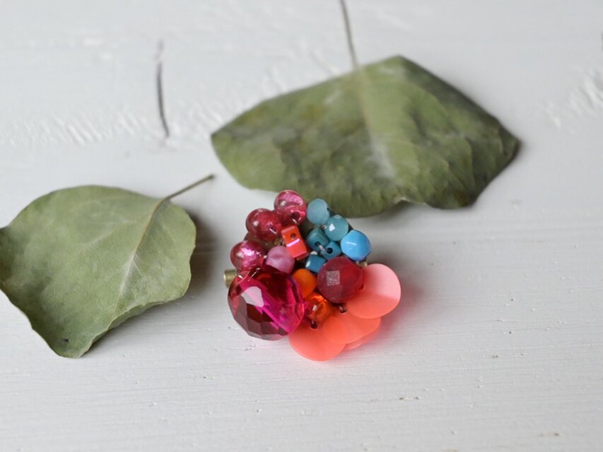 あめ玉のようにころんとしたローズピンクを主役に、オレンジやブルー、ピンクのビーズをぎゅっと集めたブローチです。