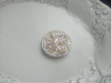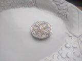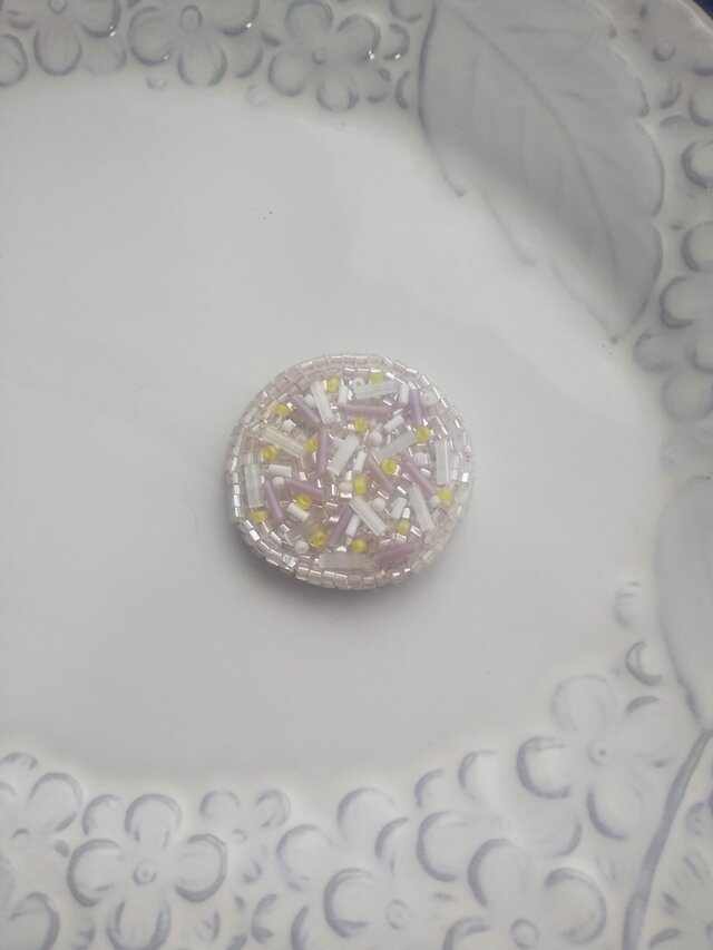 霜柱のイメージとのことでしたが、竹ビーズを使った花びらがとても新鮮で、仲良く手をつないでウェーブを作っているみたいで、とても可愛いブローチでした。 ホワイト一色に見えて、1段目と2段目の間から土台のビーズがキラッと光って見えてお洒落です。