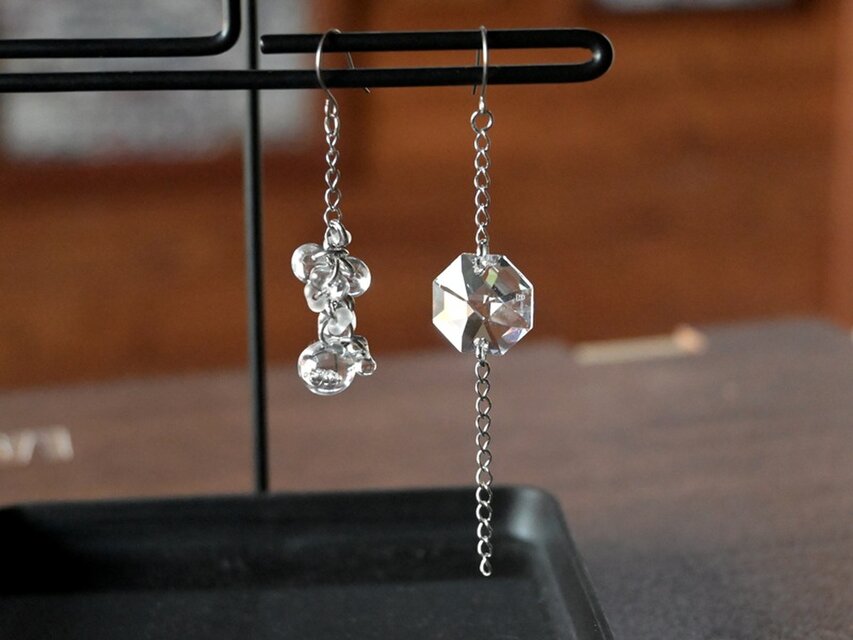 光をまとうような透明感が魅力の、アシンメトリーピアスです。