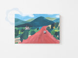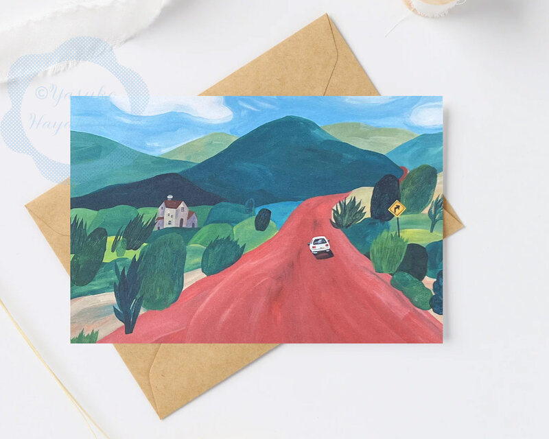 (105)赤い道と白い車の風景 ポストカード 3枚セット
