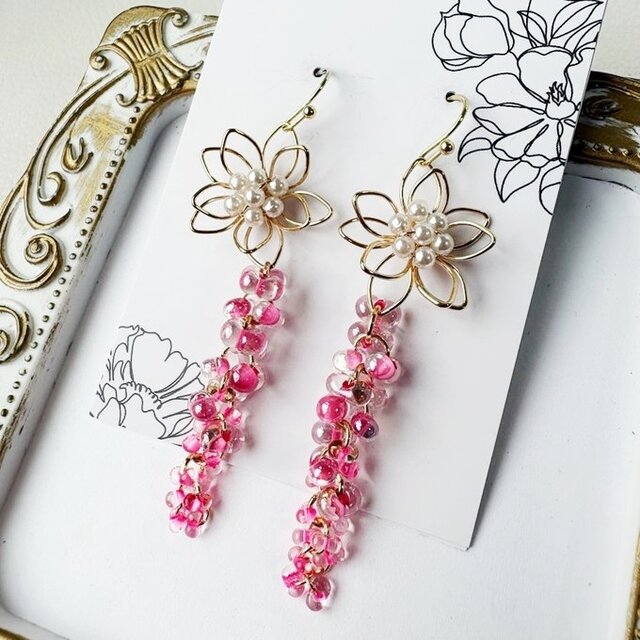 パールのついたお花&揺れるロングピアスはおススメです。