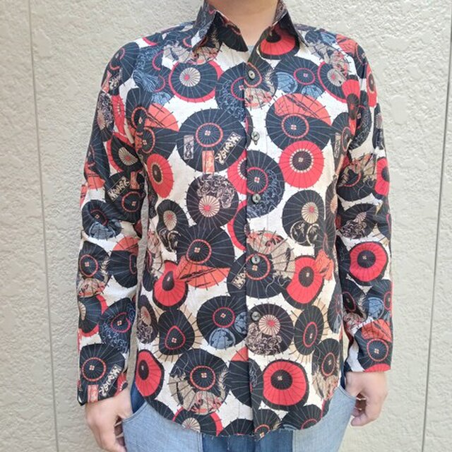 中肉厚の変り織りの生地に番傘が描かれた粋なシャツ