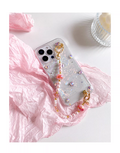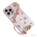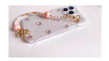 こちらは、[フラワー / ハート / ドット / ジオメトリック / 猫モチーフ / イラスト]など、印象の異なるデザインに、手首に通して使えるビーズハンドストラップを組み合わせたiPhoneケースです。