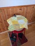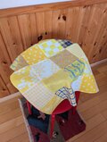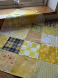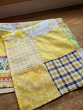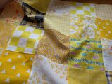 イエローの可愛いコットン生地を沢山(10種類前後)集めた正方形のパッチワーク♥️インテリアのアクセントに♡窓に掛けたりTVなど使っていない時の目隠しに家電製品にちょこっと掛けるのもいい♥️