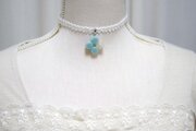 不透明なブルーの粒を三つ、そしてお花にパール、ブリオンを沈めた透明の粒を一つアクセントに連ねた可憐なレジンを、サテンリボンにタティングレースで装飾を施したチョーカーに仕上げました。