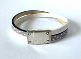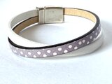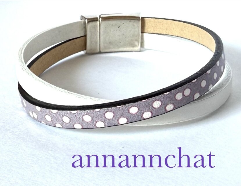 ヨーロッパ製の本革 それぞれ 5㎜ ラベンダーに水玉のデザイン・白 で おしゃれな二重のブレスレットを作りました。