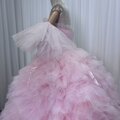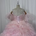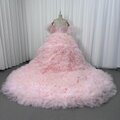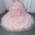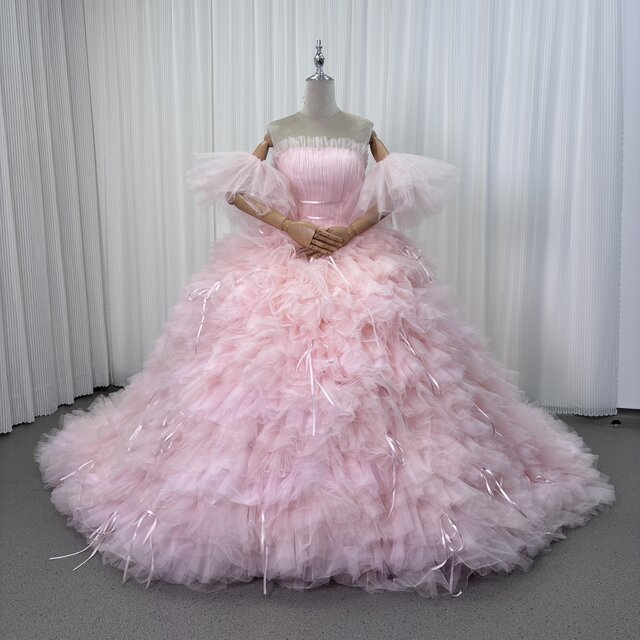 豪華!カラードレス ピンク ベアトップ ふわふわ袖 グラデーション 柔らかく重ねたチュールスカート リボン 花嫁 前撮り