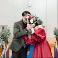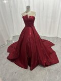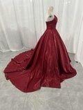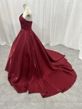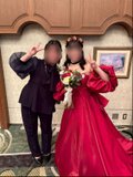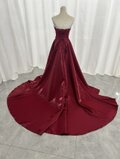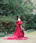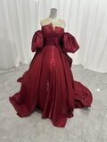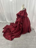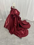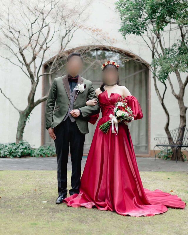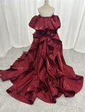 実例写真!カラードレス 赤 ベアトップ パフスリーブ ふっくら柔らかなバックリボン 光沢サテン 花嫁/前撮り