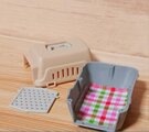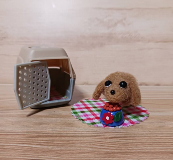 こちらは羊毛フェルトで丁寧に作られた可愛い子犬のミニチュアと、専用のキャリーケース、フードボウル(餌皿)のセットです。