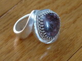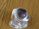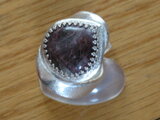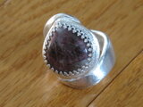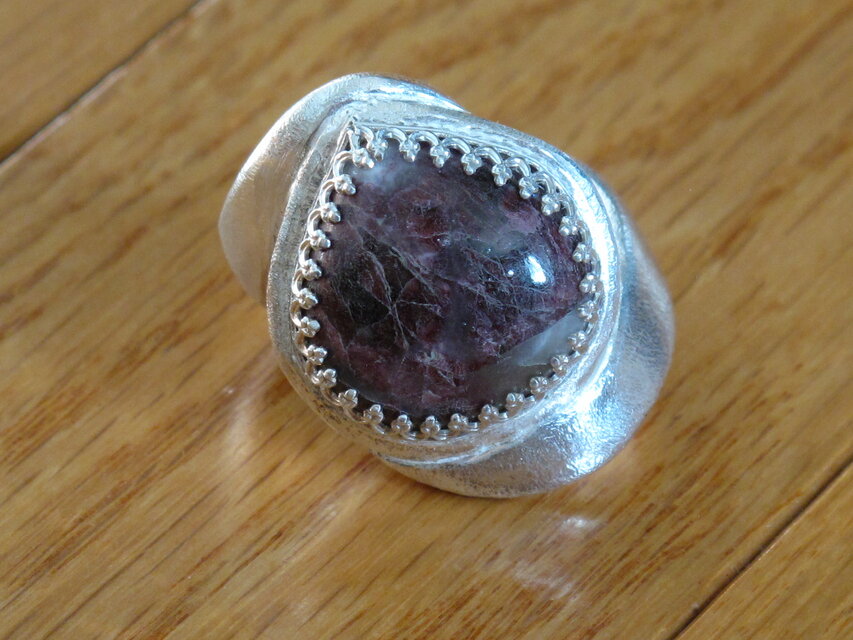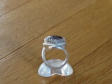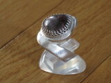 リングのサイズは13号、重さは17g、最大幅は26mm、手のひら側の幅は8mm、金属部分は純銀です。
