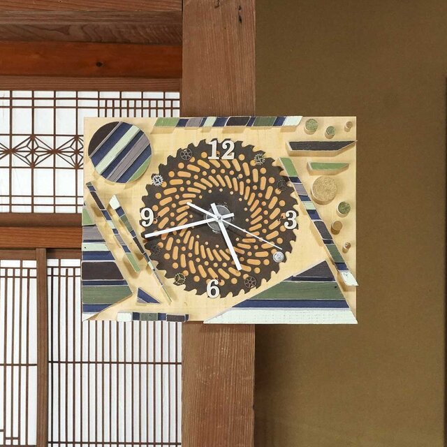 時計盤には古民家の廃材など薄い板、窓枠などを利用して新しい感覚に作り変えました。