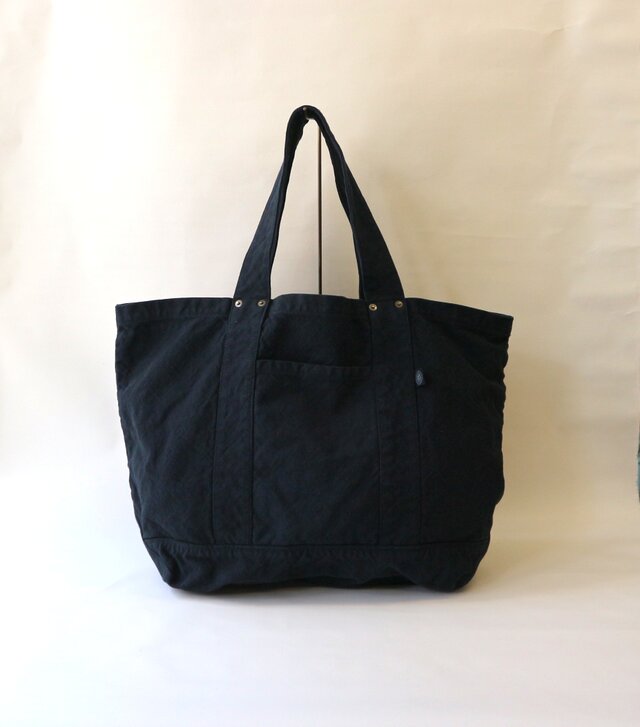 大きいながら、外ポケットが表裏にひとつずつあるので、小物の出し入れもしやすいトートバッグです。