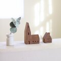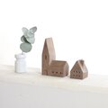 そっと置くだけで、そこから小さな物語が始まりそうな木の家たち。