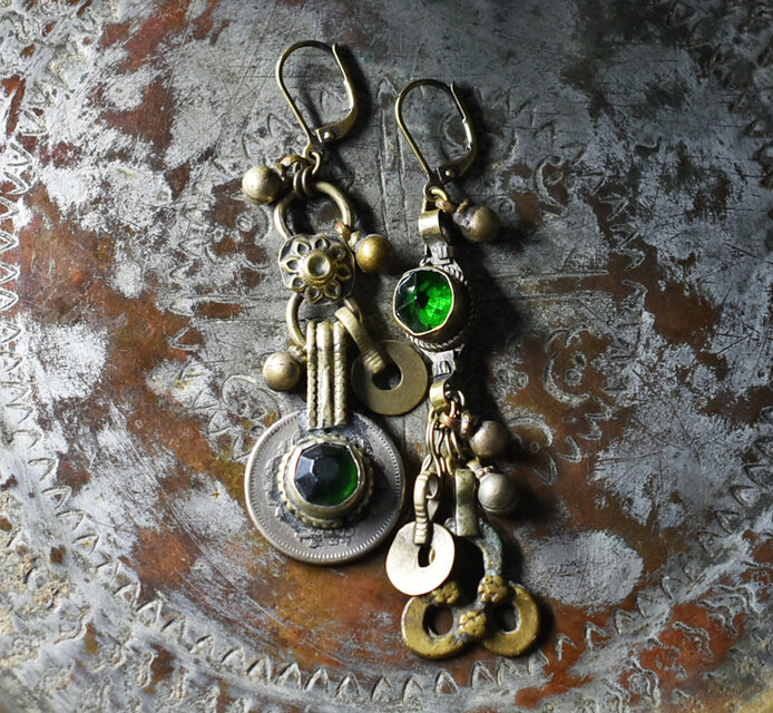 oldコインと多彩oldアフガンメタル、民族鈴を繋いだアンシメトリーなピアスです。
