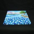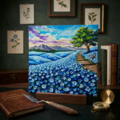 「幸せを運ぶ青い丘」では、一輪一輪が丁寧に描かれたネモフィラが、光の当たり方によって変化する表情を持ち、その生命力を感じさせます。夕暮れや夜明けの柔らかな光が、丘の深いブルーを引き立て、観る者に深い奥行きをもたらします。永遠に続く青い丘の中で、静寂な連峰や咲き誇る花々のコントラストが印象的で、心を豊かに彩ります。