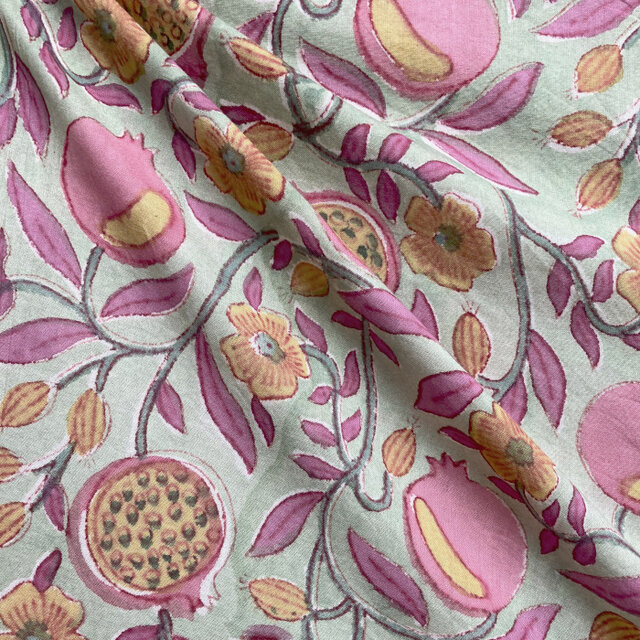 インド ブロックプリント生地 [50cm単位] サンガネリ ザクロ on グリーン 花 フラワー PP IF0499