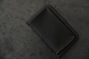 留め具を縦に起こして、左右に開く仕様です。片側で約15枚、左右で厚めの名刺が約30枚収納できます。