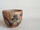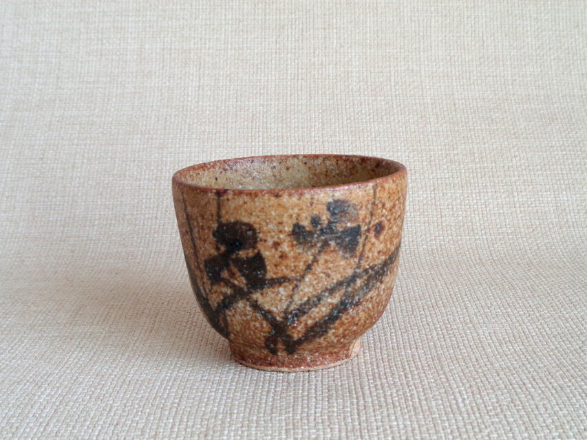 この作品は、信楽の土を用いろくろで成形し、絵付けと焼成を重ねています。高台も丁寧に仕上げています。素朴で温かみのある鉄絵には、近くの田んぼから採取した原料を用い、自陶房で調合した鉄釉を使用しています。落ち着いた色合いに鉄絵が映える湯のみです。手になじみ、土の温もりが心地よく伝わります。