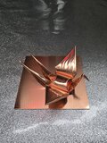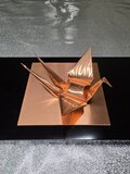 本作品は、純銅板を一羽一羽丁寧に折り上げた繊細な折り鶴です。銅は年月とともに深みを増し、落ち着いた黒褐色へと静かに変化していきます。