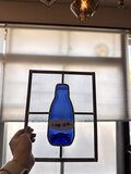 形状を持つ青とグレーのステンドグラスアートで、白い帯とカラフルなミルフィオリの装飾が特徴。