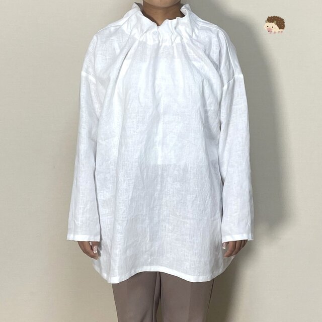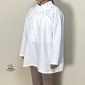 ★さらっとリネン★フラワーネックブラウス 長袖◆オフホワイト◆フリーサイズ(中厚、リネン100%)