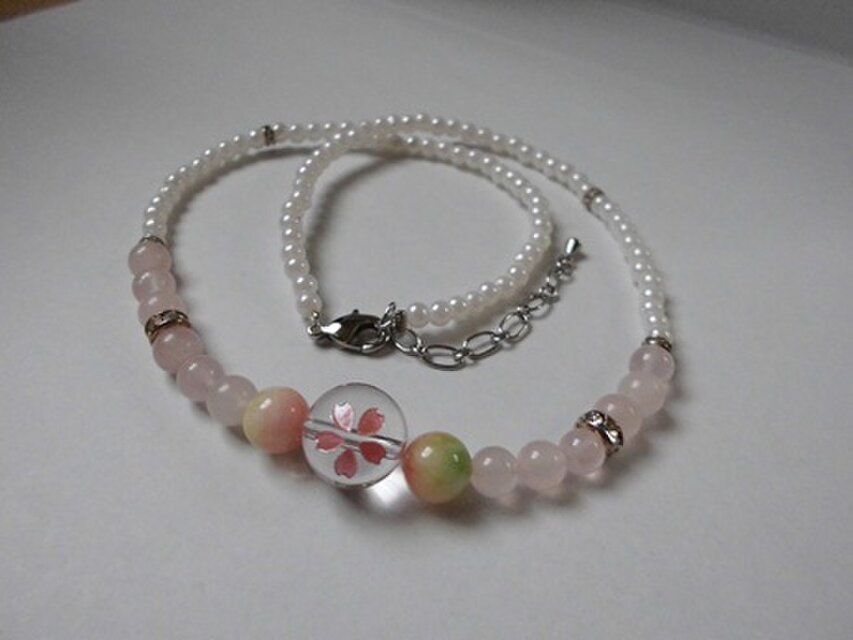 中心の桜の彫刻入りは「水晶」12ミリの珠。両脇は染めの入った「ジェード」8ミリ