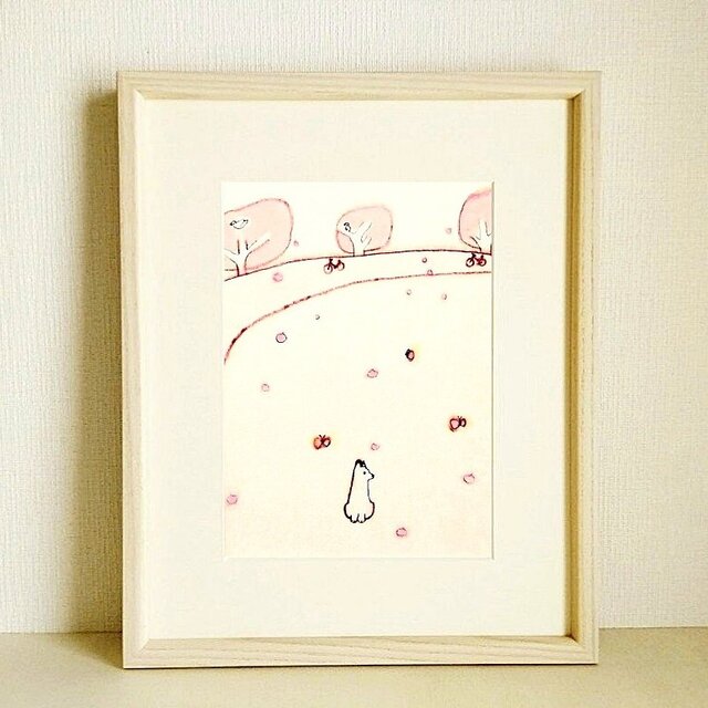 インテリア インテリアアート 北欧 北欧インテリア ナチュラルインテリア イラスト イラストレーター アナログイラスト オリジナル額縁 無垢材 額縁 絵画 リラックス 新築祝い 引っ越し祝い 開店祝い 誕生日 白い犬 犬の絵 かわいい絵 犬 桜 春