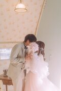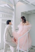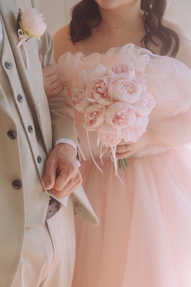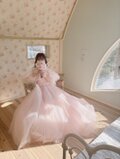 実例写真!カラードレス 薄ピンク オフショルダー ソフトチュール ロングトレーン 前撮り