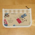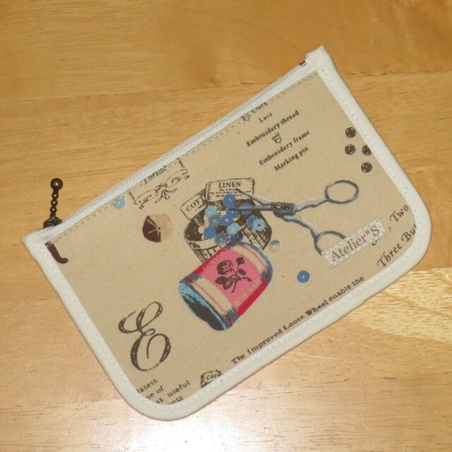 ベージュ地に糸やボタンなどソーイングをモチーフにした柄の生地にベージュのチェックを合わせました。