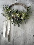 サイズ約31×38㎝ユーカリやアジサイ、木の実などプリザーブドフラワーで作りましたので長い期間お楽しみいただけます。15種もの植物が集まりました。ユーカリの実を合わせてより生命が宿ったような動きも作りました。モスなどグリーン系が目に優しいです。適した環境は涼しめの光が当たりにくい暗い場所が1番いい状態を長く保ちます。次に日陰です。