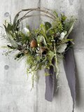 サイズ約28×30㎝植物が踊るリース。たっぷりの緑を集めた贅沢なグリーンリース。ユーカリを楽しむためのドライフラワーです。ユーカリが主役のナチュラルリース。ほのかに残るユーカリの優しい香りをお楽しみください。ユーカリと相性の良いルナリアやモス、ユーカリの実を合わせてより生命が宿ったような動きも作りました。ペッパーベリーやモスなどグリーン系が目に優しいです。適した環境は涼しめの光が当たりにくい暗い場所が1番いい状態を長く保ちます。次に日陰です。