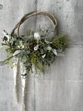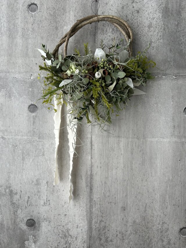サイズ約30×28㎝ユーカリを楽しむためのドライフラワーです。ユーカリが主役のナチュラルリース。ほのかに残るユーカリの優しい香りをお楽しみください。ユーカリと相性の良いルナリアやモス、ユーカリの実を合わせてより生命が宿ったような動きも作りました。ペッパーベリーやモスなどグリーン系が目に優しいです。適した環境は涼しめの光が当たりにくい暗い場所が1番いい状態を長く保ちます。次に日陰です。