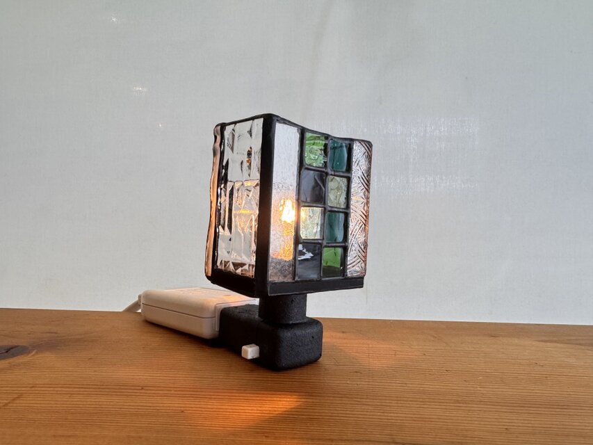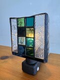 落ち着いた雰囲気のステンドグラスランプ、緑と青と黒の色合いが美しい。